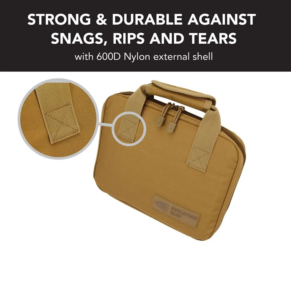The Evolution Gear Pistol Bag offers safe protective transportation of your hand gun and magazines. This Soft case was designed for the purpose of increased protection, safety and functionality.